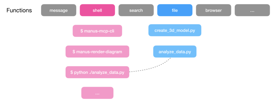 Manus 将这一点视为一个分层的行动空间,包括函数/工具调用层和虚拟计算机沙箱层。Peak 提到,Manus 使用的原子函数数量很少(少于 20 个),其中包括 Bash 工具、用于管理文件系统的工具,以及代码执行工具。
