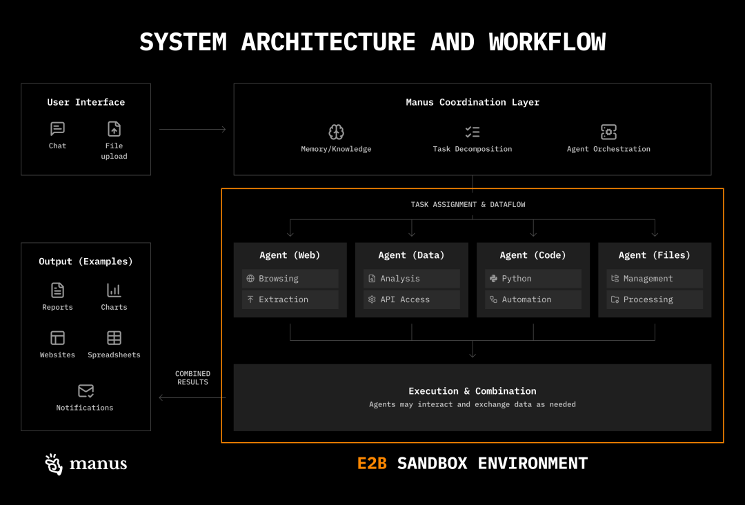 Manus 使用多 agent 架构,其中包括一个负责分配任务的规划器(planner),一个负责回顾对话并决定哪些内容应该保存到文件系统中的知识管理器(knowledge manager),以及一个执行由规划器分配任务的执行子 agent。