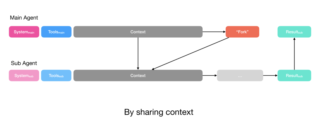 对于更复杂的任务(例如子 agent 需要写入规划器也会使用的文件),规划器会将其完整上下文共享给子 agent。子 agent 仍然拥有自己的行动空间(工具)和指令,但同时也会接收与规划器相同的完整上下文。