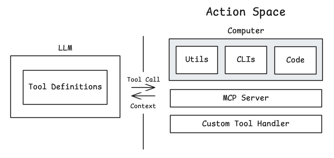 Agent 需要知道有哪些动作是可用的。一种做法是将动作放在工具调用层,并在一开始就将工具定义加载进上下文。