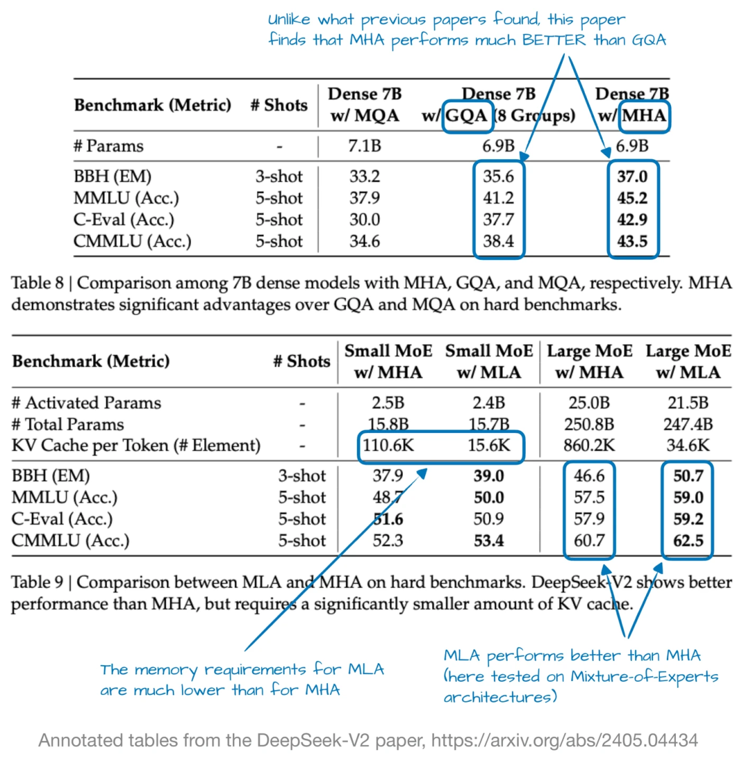 另外,正如前面提到的,MLA 并非在 DeepSeek V3 中首次出现,因为它的前身 DeepSeek V2 也使用了(甚至是首次引入了)这一机制。此外,V2 论文中包含了一些有趣的消融实验,或许可以解释 DeepSeek 团队为何选择 MLA 而不是 GQA(见下图)。