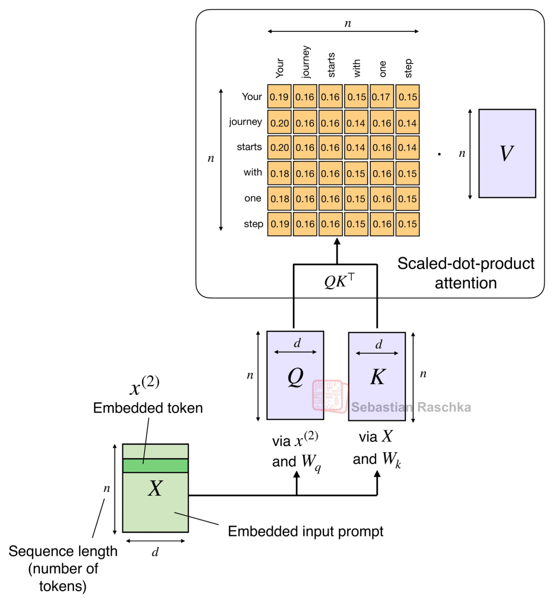 回顾一下,缩放点积注意力的计算形式为 softmax(QKᵀ)V,其中 Q 和 K 是 n×d 的矩阵,n 为输入 token 的数量,d 为嵌入维度。因此,QKᵀ 会生成一个 n×n 的注意力矩阵,并与 n×d 的 value 矩阵 V 相乘: