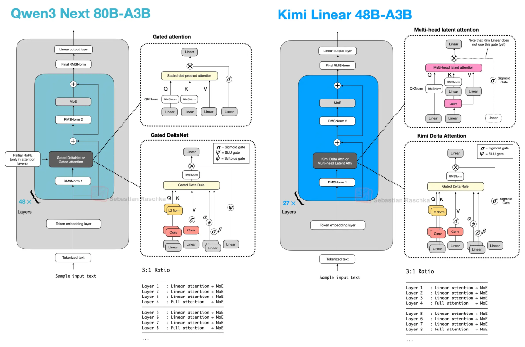 (需要注意的是,为了简化说明,我省略了 Qwen3-Next 和 Kimi Linear 中使用的卷积混合部分。)