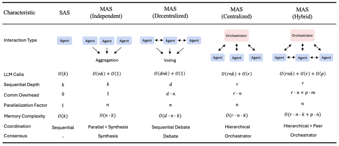 • 单智能体(SAS): 一个独立的智能体,使用统一的记忆流,顺序执行所有推理与行动步骤。 -