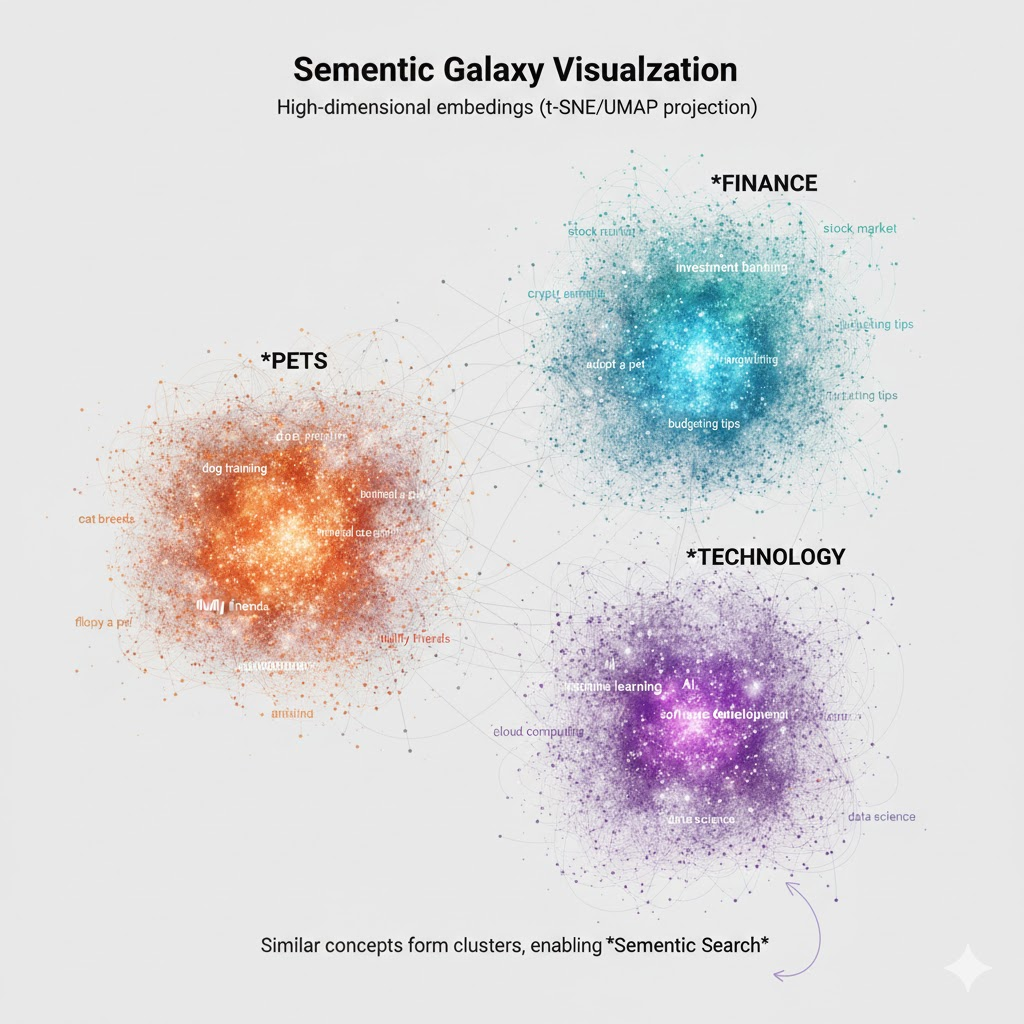 语义星系的特征是:同类内容聚集,异类内容疏离。这种结构是语义搜索能够成立的物理基础。