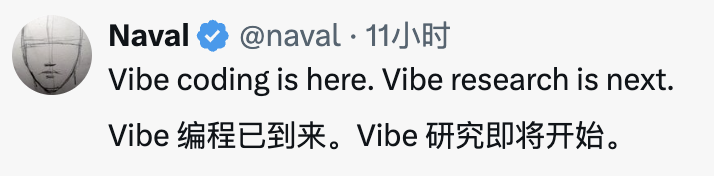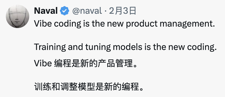 最近几天,Naval连续发了的两条推文,它所提出的 Vibe Coding(氛围编码) 标志着软件开发进入了从“过程导向”向“结果导向”跨越的临界点。