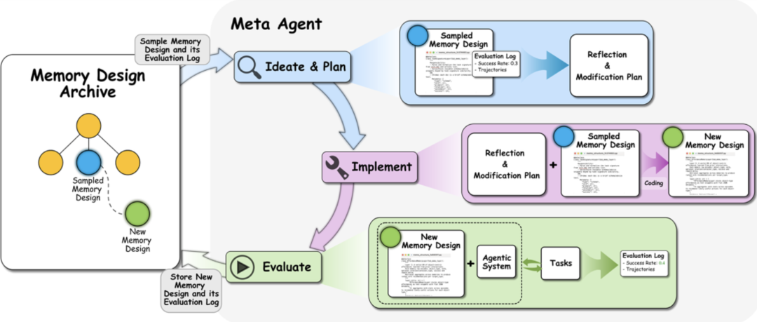 元代理从存档中采样先前探索的记忆设计,存档中存储了所有探索的记忆设计及其评估日志。然后元代理反思采样的记忆设计以生成新的想法和计划,这些想法和计划在代码中实现。新的设计随后被验证和评估,产生的日志被添加回存档以指导未来的采样。