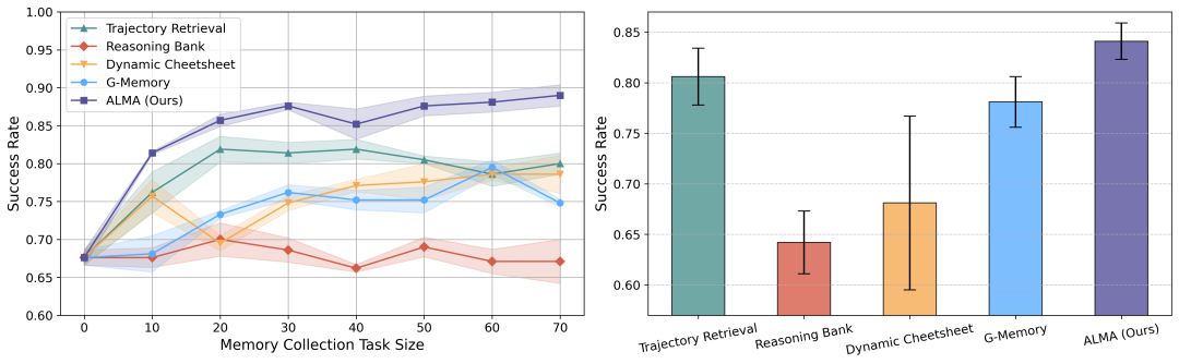 学习到的记忆设计在所有基准测试中始终优于所有当前最先进的人工设计记忆基线。这适用于由 GPT-5-nano 和 GPT-5-mini 驱动的自主系统,表明发现的记忆设计可以更有效地存储和重用过去的经验,以支持在测试时自主系统的持续学习。此外,随着基础模型能力的增强,性能提升更加显著,这表明我们的学习记忆设计可以泛化到不同的基础模型,并在底层自主系统变得更强大时提供更强的支持。总体而言,这些结果表明改进是稳健的,并非特定于某个模型,突出了我们方法的可扩展性和通用性。