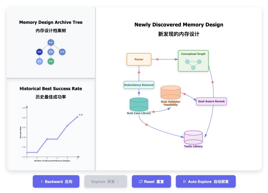 我们在《Baba Is AI》中包含了一个关于前六种记忆设计的示例学习过程。完整的学习过程可以在我们的论文中找到。记忆设计档案树展示了在开放式探索过程中,如何存档和结构化已发现的记忆设计。ALMA 在不断增长的、基于先前发现的档案中逐步发现新的记忆设计。