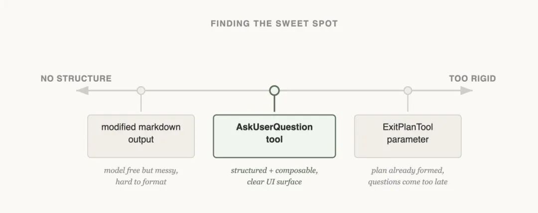 我们首先尝试的是给 ExitPlanTool 添加一个参数,让计划旁边有一个问题数组。这是最容易实现的事情,但它让 Claude 感到困惑,因为我们同时要求一个计划和一个关于计划的问题集。如果用户的答案与计划内容冲突怎么办?Claude 需要调用 ExitPlanTool 两次吗?我们需要另一种方法。