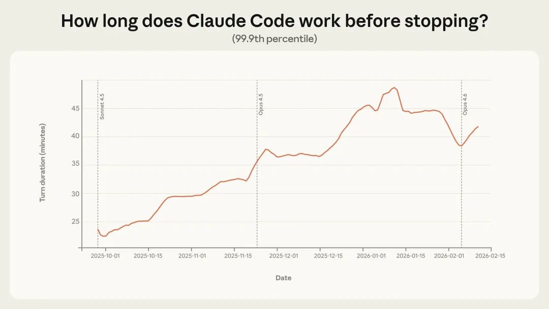 更有信息量的是尾部。最长回合最能反映 Claude Code 最具野心的用法,也指向自主性的走向。2025 年 10 月到 2026 年 1 月,99.9 分位回合时长几乎翻倍,从不到 25 分钟增长到超过 45 分钟(图 1)。