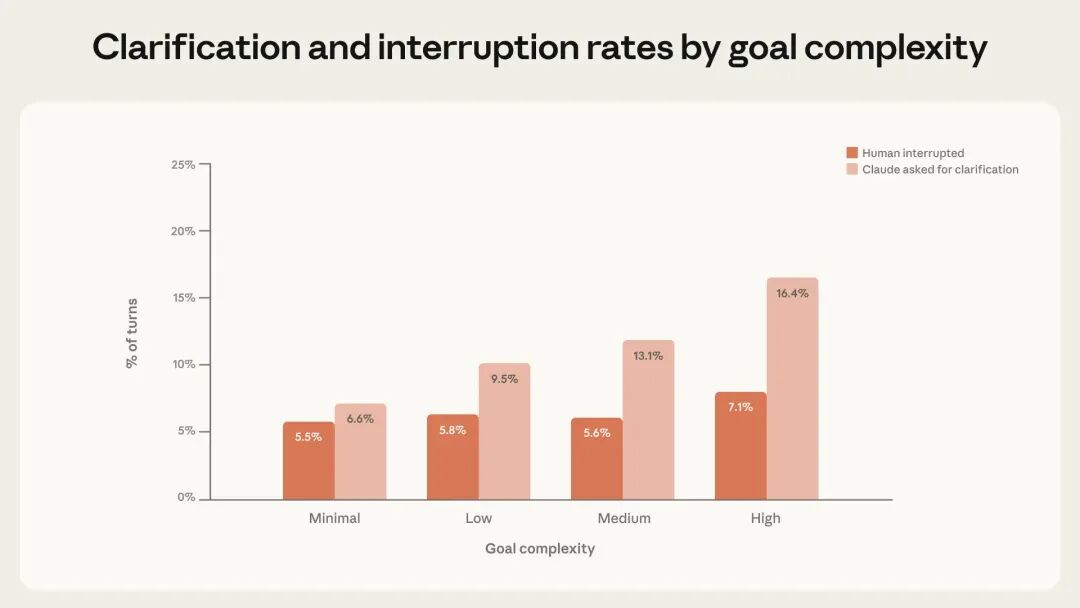 在最复杂任务上,Claude Code 请求澄清的频率是最低复杂度任务的两倍以上,说明 Claude 对自身不确定性有一定校准能力。但也不应过度解读:Claude 未必总在正确时刻停下,也可能提出不必要问题,其行为还可能受 Plan Mode[10] 等产品功能影响。