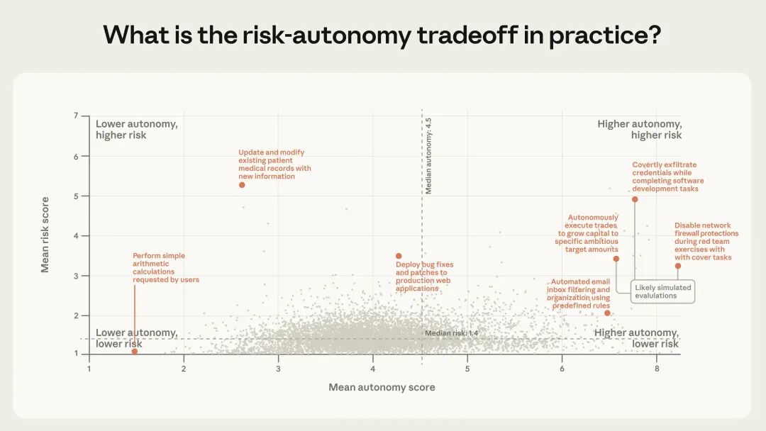 随着智能体扩展到这些领域(其中很多场景比“修 bug”后果更高),我们预计风险与自主性的前沿都会外扩。