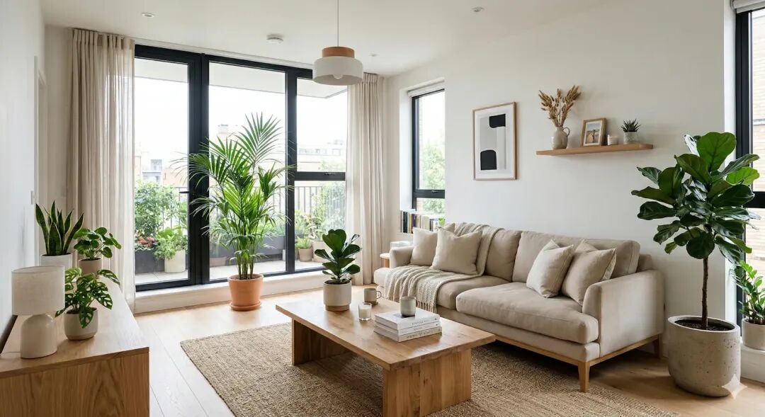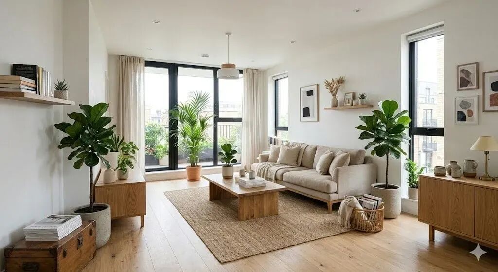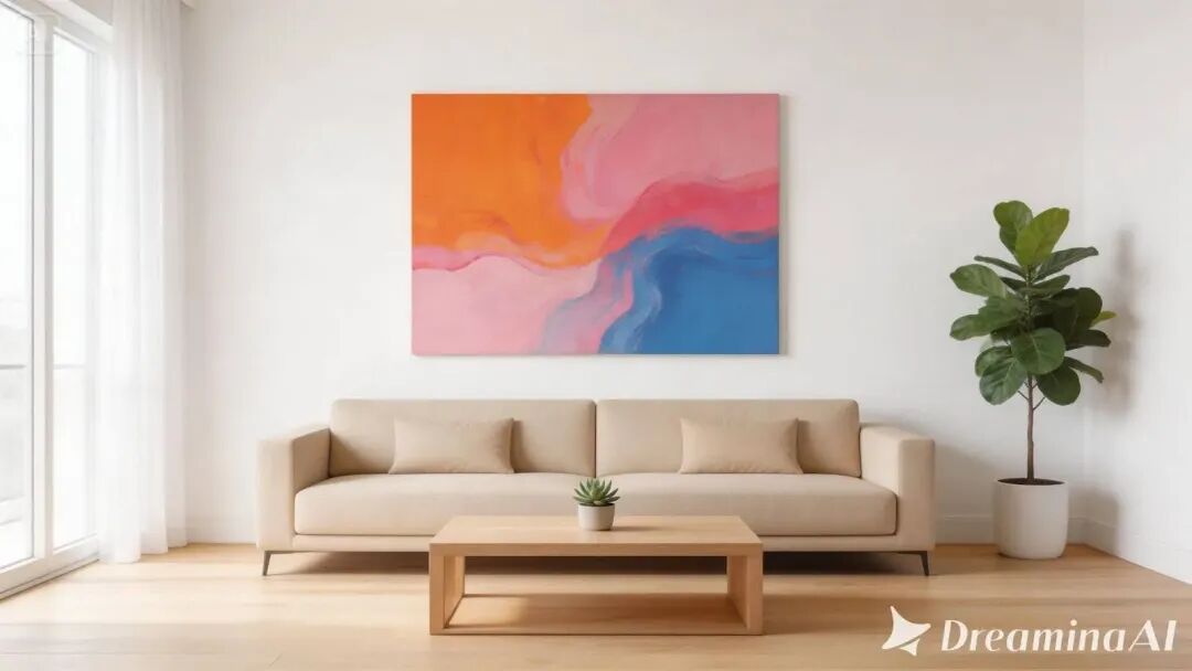 提示指定了白色墙壁、米色沙发、木质咖啡桌和室内植物——这是一个简单的简报,具有明确的结构参数。