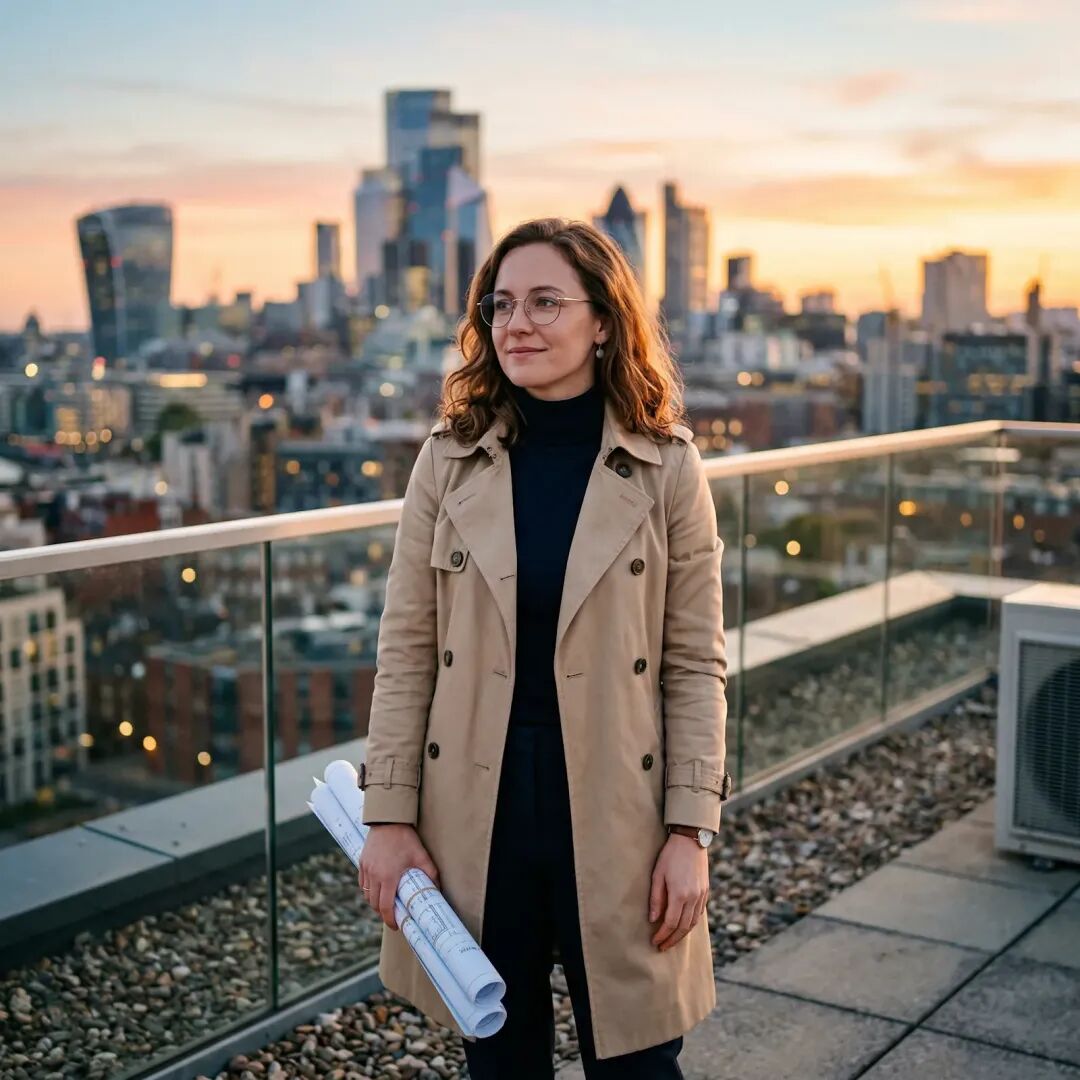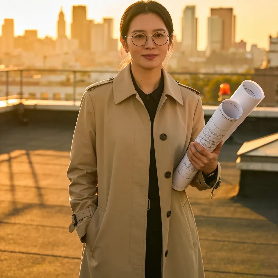 简述:一位 32 岁的女性建筑师的影像,在日落时分的屋顶上,身穿米色风衣,戴着圆形眼镜,左手拿着卷起的蓝图,背景中的城市天际线略微失焦,金色时刻的光线配合柔和的边缘光,浅景深模拟 50mm 镜头,垂直 4:5 的宽高比,逼真的皮肤纹理和微妙的胶片颗粒感。列表中的每个元素都是一个可能独立失效的约束条件。