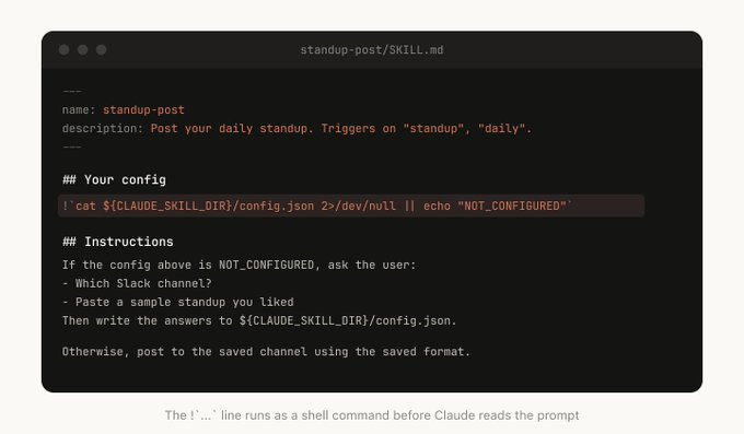 有些 skill 可能需要先根据用户提供的上下文来完成设置。例如,如果你做的是一个把 standup 发到 Slack 的 skill,你可能会希望 Claude 先问清楚该发到哪个 Slack 频道。