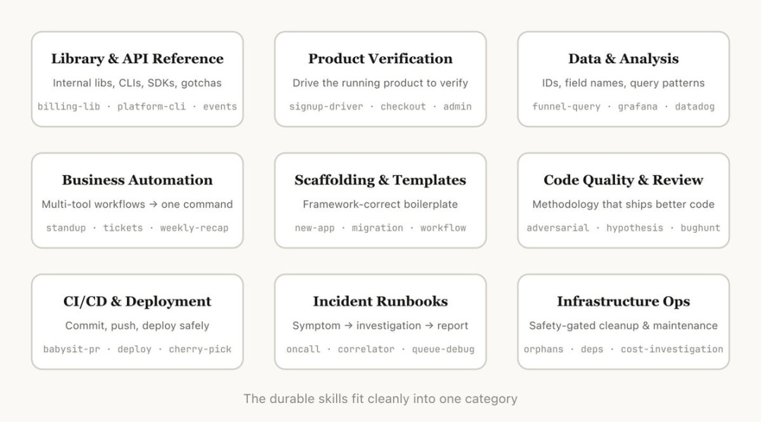 在梳理完我们所有的 skills 之后,我们发现它们通常会落入几个反复出现的类别。最好的 skills 往往能清晰地归入其中一类;那些让人困惑的,通常横跨了多个类别。这不是一个最终定论式的清单,但它是一个不错的思考方式,能帮助你判断自己的组织内部是不是缺了某一类 skill。