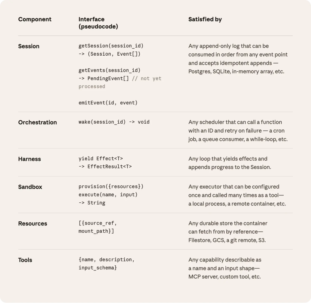 Meta-harness 设计意味着要对围绕 Claude 的接口保持明确主张:Anthropic 预计 Claude 将需要操作状态(session)和执行计算(sandbox)的能力。他们也预计 Claude 将需要扩展到多个大脑和多只手。他们将这些接口设计为能够在长时间范围内可靠且安全地运行。但他们并不对 Claude 将需要的大脑和手的数量或位置作出任何假设。